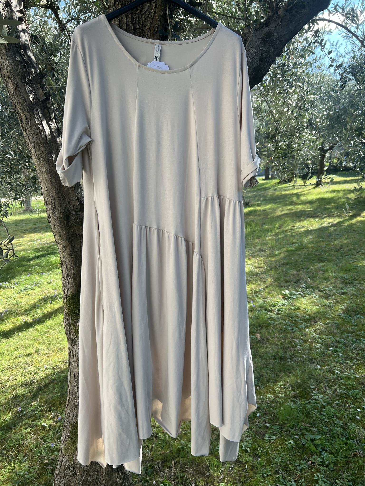 Abito in cotone elasticizzato assimmetrico. Taglia unica che veste dalla 46 alla 56 abbondante.