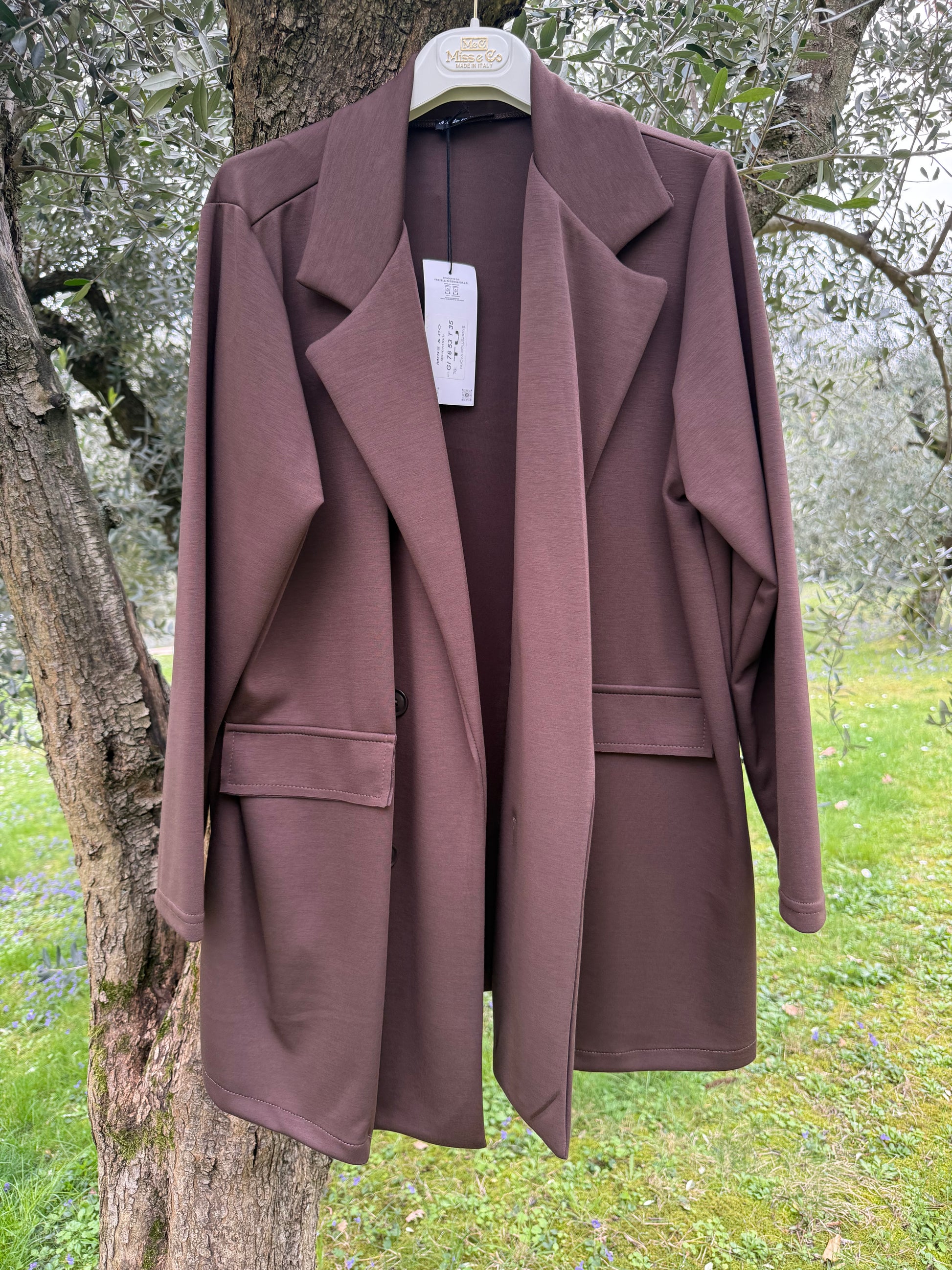 Blazer in tessuto scuba doppiopetto senza allacciatura, può essere utilizzato anche come capospalla leggero.