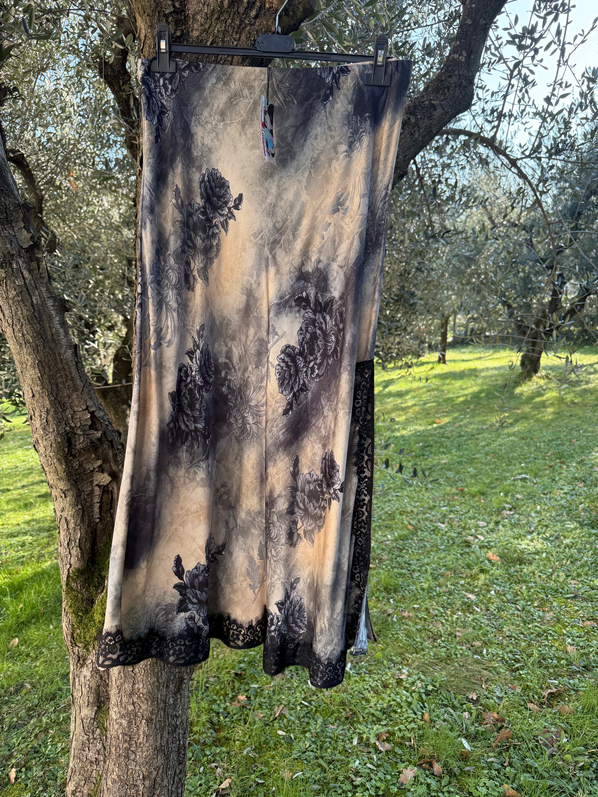 Gonna con taglio a sirena bordata con pizzo spacco laterale. Elastico in vita. Fantasia floreale